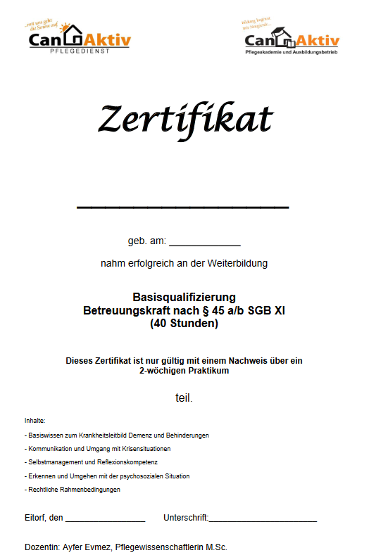 Die Teilnahme an der E-Learning-Plattform bietet nicht nur Fachwissen und praktische Fähigkeiten, sondern auch Zertifikate und Abschlüsse, die die professionelle Entwicklung der Pflegekräfte dokumentieren. Diese Anerkennung kann nicht nur die Karrierechancen verbessern, sondern auch das Vertrauen von Patienten und ihren Familien in die Qualität der Pflege stärken. Das Besondere an der E-Learning Plattform: Der Teilnehmer kann sich nach dem erfolgreich abgeschlossenen Kurs sein individualisiertes Zertifikat sofort runterladen. Datum und Name werden von der Plattform automatisch eingetragen. Von der schnellen Abwicklung profitieren nicht nur die Demenzbegleiter; die Administration des Pflegedienstes CanAktiv wird stark entlastet.
